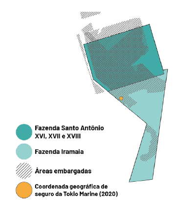 Em uma segunda propriedade da família, a Fazenda Iramaia V, para a qual a Tokio Marine também ofereceu seguro no mesmo período, as coordenadas geográficas da apólice divulgadas pelo Mapa incidem dentro de uma área de 470 hectares embargadas pela Sema-MT em 2016.