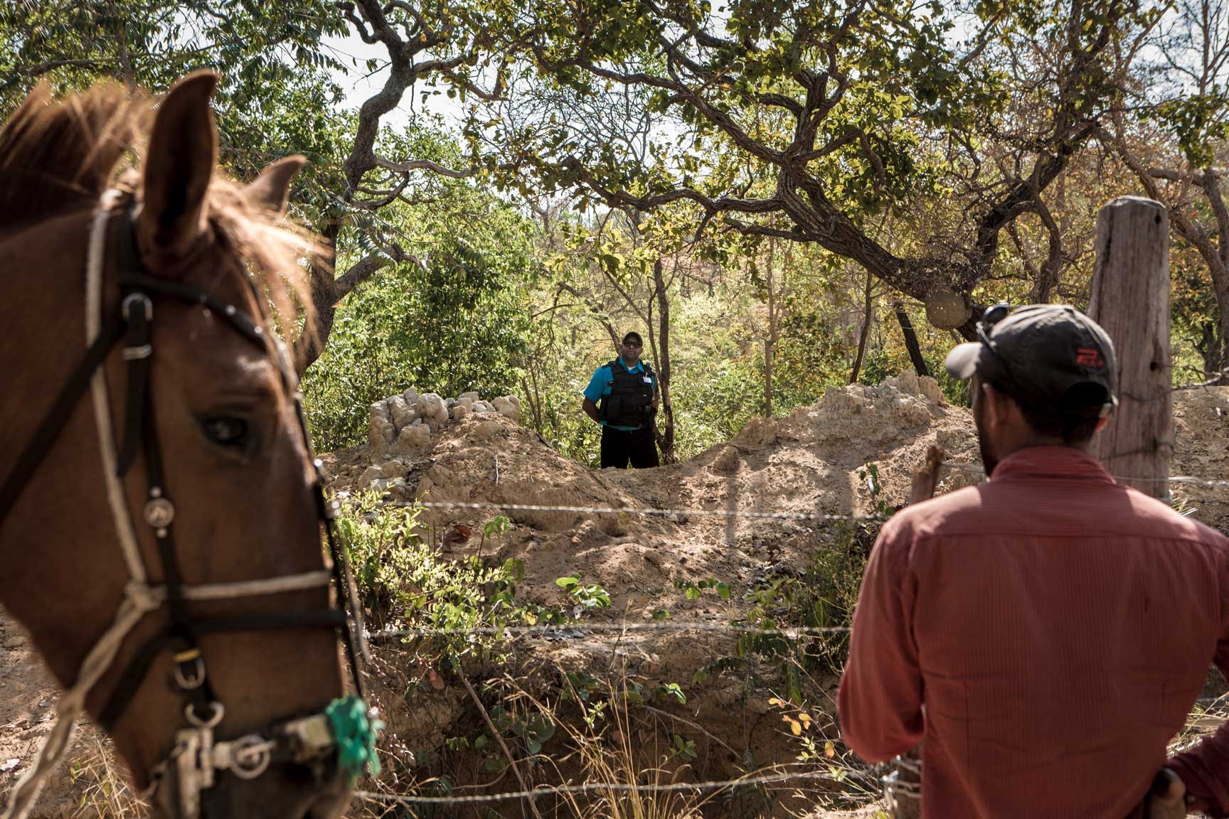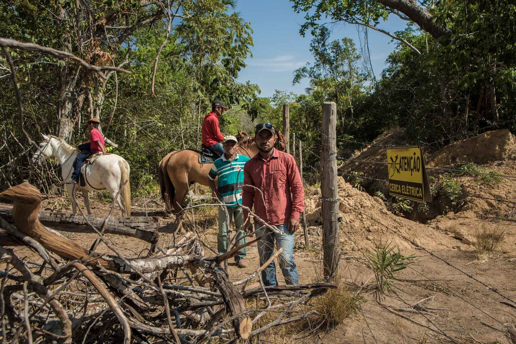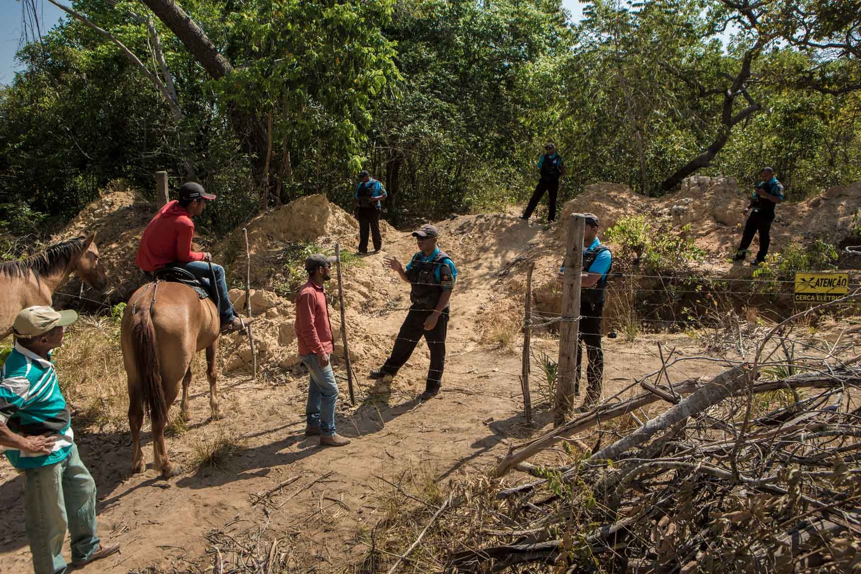 Em Cachoeira, não há sinal de telefone nem de internet. Os únicos capazes de se comunicar são os seguranças da Estrondo, por rádio. A equipe da Repórter Brasil acompanhou Ednaldo e o irmão, Jassonê, de 33 anos, à cerca que dividiu o território e o rebanho da família. Do outro lado do fosso, estavam os seguranças da Estrela Guia, a terceirizada contratada para serviços de vigilância.