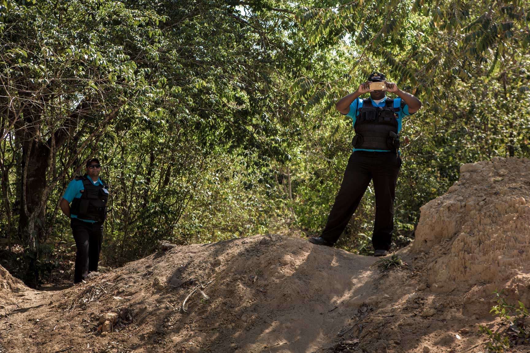 Em pouco mais de dez minutos de conversa, três seguranças armados chegaram em uma caminhonete e juntaram-se aos dois que lá já estavam. Dois filmaram e fotografaram a equipe de reportagem. Outro anotou a placa do veículo -- cenas que se repetiram ao longo de toda a semana. Jassonê questionou os métodos de trabalho dos seguranças, que, segundo ele, agem como jagunços. Um dos seguranças respondeu seguir ordens do “líder” [os gerentes da Estrondo]. Quando questionado se tinha ordens para atirar caso os moradores avançassem, o segurança respondeu para a câmera: "Isso você pergunta para os donos da empresa."